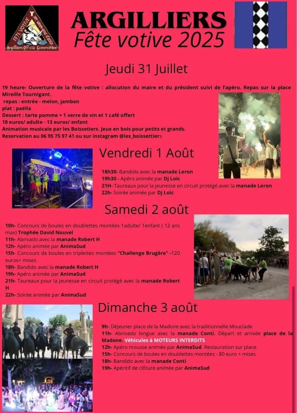 Jeudi 31 Juillet 19h00: Ouverture de la fête 🎉 - Allocution du maire et du président suivie de l'apéro. Repas sur la place : entrée, melon, jambon. Plat : paëlla. Dessert : tarte pomme + 1 verre de vin et 1 café offert. Animation musicale par les Boissetiers 🎵. Jeux en bois pour petits et grands. Vendredi 1 Août 18h30: Bandido avec la manade Leron 🐂 19h30: Apéro animé par Dj Loic 🎵 21h00: Taureaux pour la jeunesse en circuit protégé avec la manade Leron 🐂 22h00: Soirée animée par Dj Loic 🎵 Samedi 2 Août 10h00: Concours de boules en doublettes montées 🎳 (1 adulte/1 enfant, 12 ans max) Trophée David Nouvel 11h00: Abrivado avec la manade Robert H 🐂 12h00: Apéro animé par AnimaSud 🎵 15h00: Concours de boules en triplettes montées "Challenge Brugère" 🎳 18h00: Bandido avec la manade Robert H 🐂 19h00: Apéro animé par AnimaSud 🎵 21h00: Taureaux pour la jeunesse en circuit protégé avec la manade Robert H 🐂 22h00: Soirée animée par AnimaSud 🎵 Dimanche 3 Août 9h00: Déjeuner place de la Madone 🍽️ avec la traditionnelle Mouclade 11h00: Abrivado longue avec la manade Conti 🐂. Départ et arrivée place de la Madone. […]