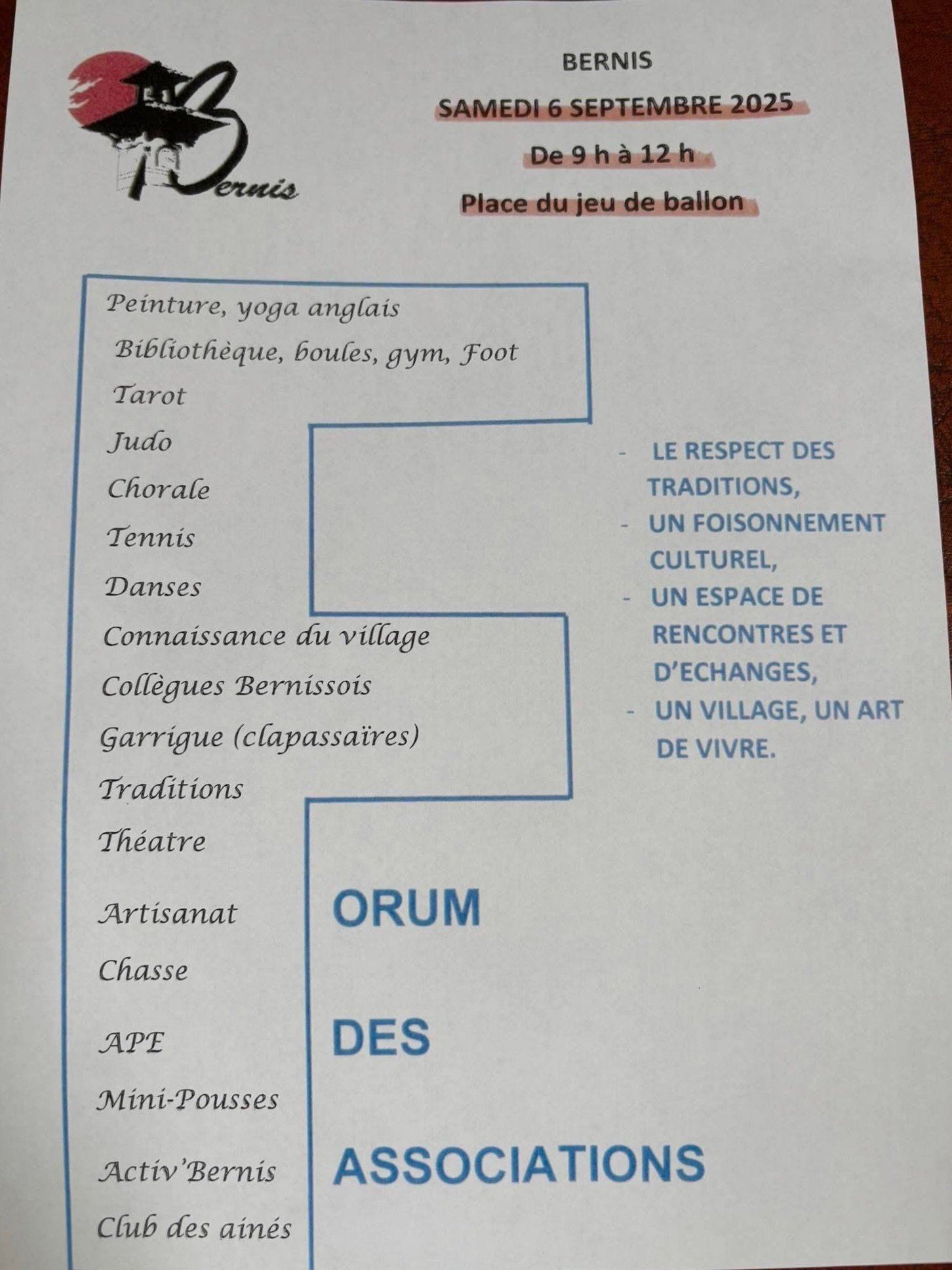 Le 19/09, la commune de Bernis a annoncé sur sa page Facebook que ce week-end était annulé en raison des conditions météorologiques. Participez à un spectacle unique en allant au Week-end taurin à Bernis, dans le Gard. Le programme de cette fête votive est disponible, heure par heure, sur cette page. Venez découvrir une programmation riche et variée qui saura vous divertir tout au long de l'événement. En plus des moments forts liés à la tauromachie, vous pourrez également profiter de nombreuses animations culturelles et gastronomiques. Ne manquez pas cette occasion de plonger dans l'ambiance festive et traditionnelle de Bernis. Venez nombreux et laissez-vous charmer par le patrimoine architectural remarquable de la commune, avec notamment l'église Saint-André et le temple protestant, témoins de son histoire. Samedi 21 septembre 2024 11h45 ABRIVADO/BANDIDO MANADE AGNEL 12h15 ANIMATION MUSICALE BAR DES PLATANES 18h45 ABRIVADO/BANDIDO MANADE AGNEL Dimanche 22 septembre 2024 OFFERT PAR LA MAIRIE DE BERNIS PENA OCCIMUSIC 11h45 ABRIVADO / BANDIDO MANADE CAYZAC vous pouvez consulter le programme de la fête votive de 2023 et celui de la fête 2024.