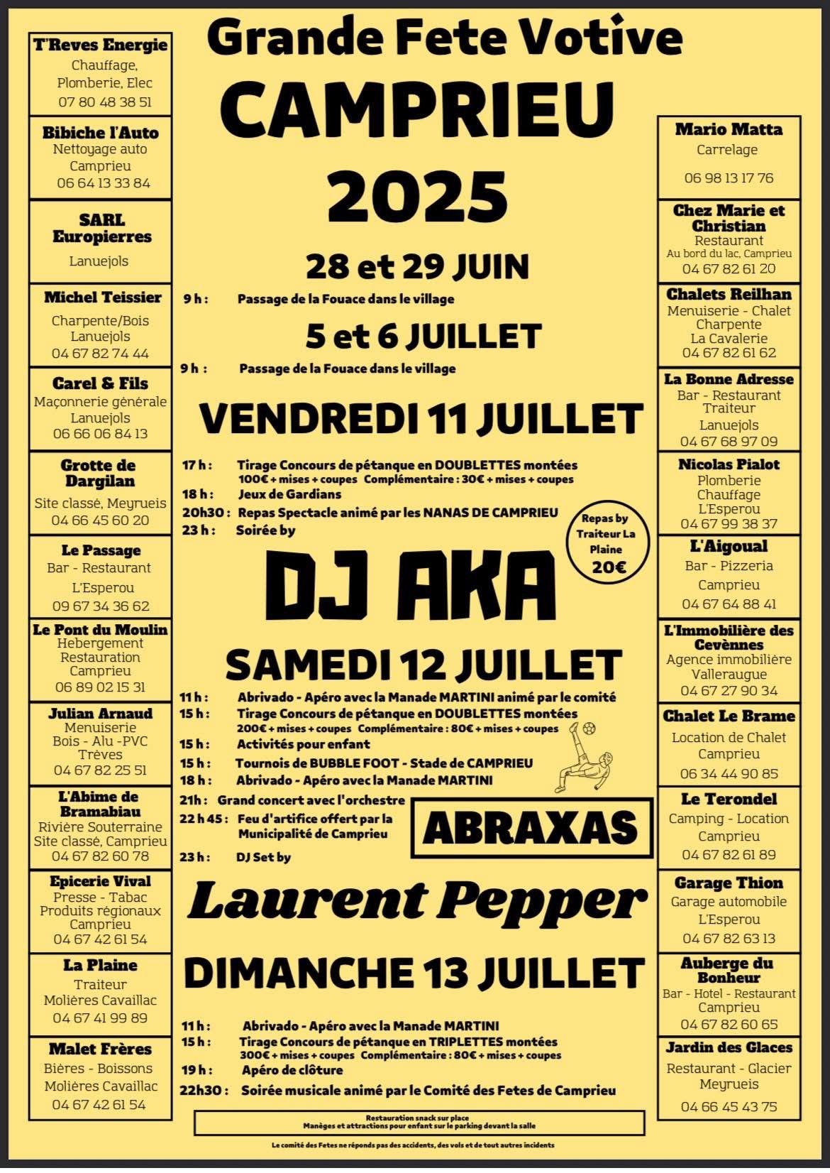 Vendredi 11 Juillet 17h : 🎯 Tirage Concours de pétanque en DOUBLETTES montées 18h : 🐂 Jeux de Gardians 20h30 : 🍽️ Repas Spectacle animé par les NANAS DE CAMPRIEU 23h : 🎵 Soirée by DJ AKA Samedi 12 Juillet 11h : 🐂 Abrivado - Apéro avec la Manade MARTINI animé par le comité 15h : 🎯 Tirage Concours de pétanque en DOUBLETTES montées 15h : ⚽ Tournoi de BUBBLE FOOT - Stade de CAMPRIEU 18h : 🐂 Abrivado - Apéro avec la Manade MARTINI 21h : 🎶 Grand concert avec l'orchestre ABRAXAS 23h : 🎆 Feu d’artifice offert par la Municipalité de Camprieu 23h : 🎧 DJ Set Dimanche 13 Juillet 11h : 🐂 Abrivado - Apéro avec la Manade MARTINI 15h : 🎯 Tirage Concours de pétanque en TRIPLETTES montées 18h : ⚽ Jeune toros 22h30 : 🎶 Soirée musicale animé par le Comité des Fêtes de Camprieu