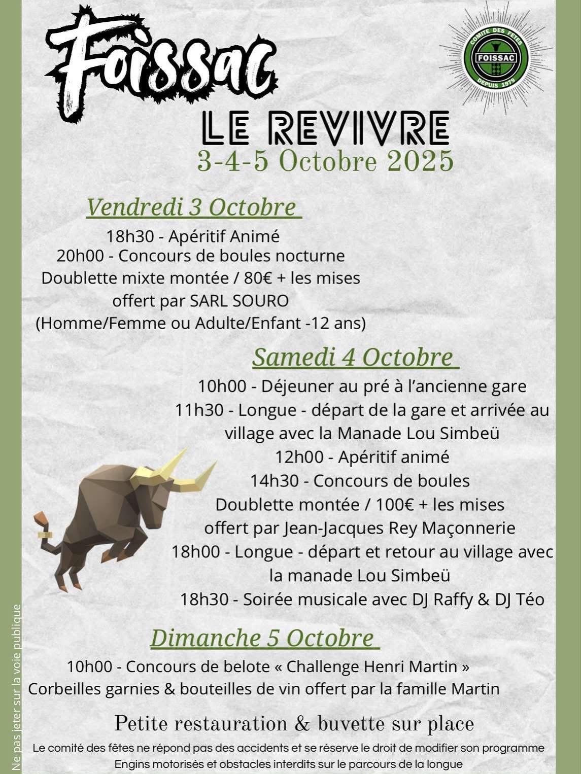 Ville de Foissac Foissac, Gard, FranceVendredi 3 octobre 18h30 - Apéritif Animé 🍹 20h00 - Concours de boules nocturne 🎳 Doublette mixte montée / 80€ + les mises 🌟 Offert par SARL SOURO (Homme/Femme ou Adulte/Enfant -12 ans) 🎁 Samedi 4 octobre 10h00 - Déjeuner au pré à l'ancienne gare 🍽️ 11h30 - Longue - départ de la gare et arrivée au village avec la Manade Lou Simbeü 🐂 12h00 - Apéritif animé 🎵 14h30 - Concours de boules 🎳 Doublette montée / 100€ + les mises 🌟 Offert par Jean-Jacques Rey Maçonnerie 🚧 18h00 - Longue - départ et retour au village avec la Manade Lou Simbeü 🐂 18h30 - Soirée musicale avec DJ Raffy & DJ Téo 🎧 Dimanche 5 octobre 10h00 - Concours de belote "Challenge Henri Martin" 🃏 Corbeilles garnies & bouteilles de vin offertes par la famille Martin 🍷