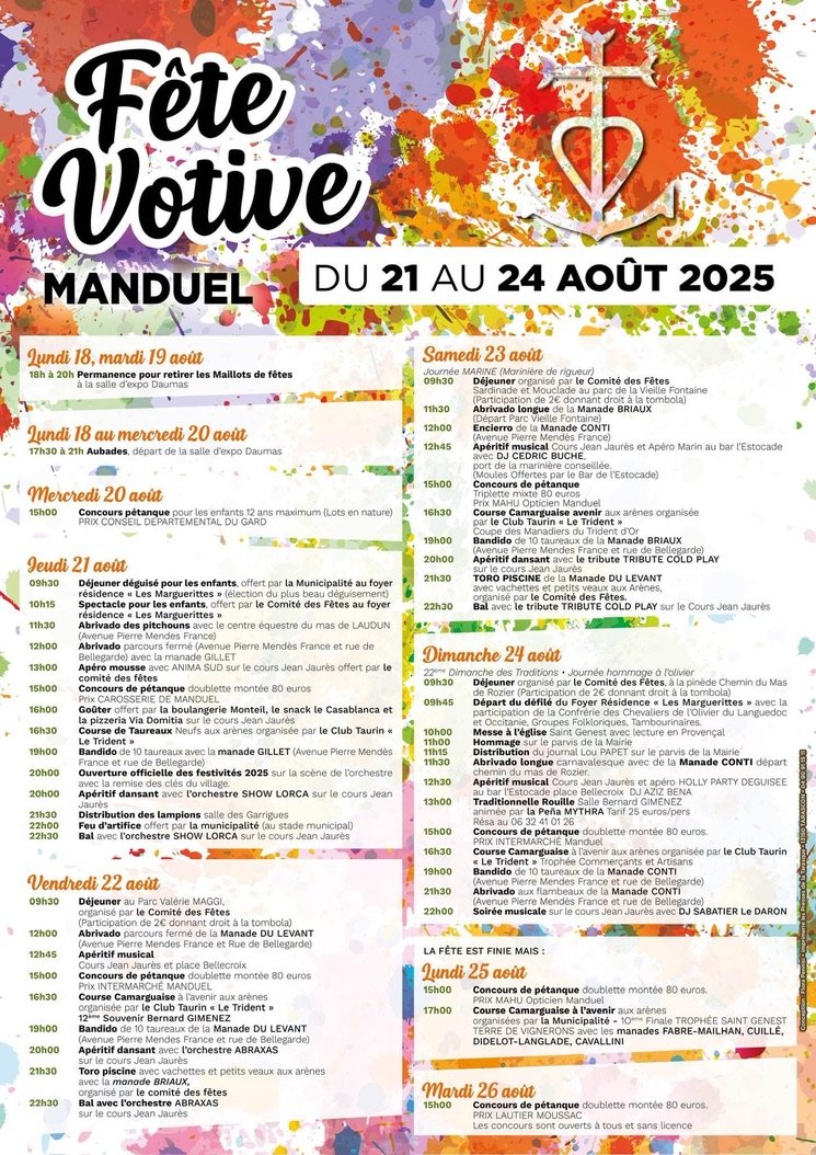 Ville de Manduel Manduel, Gard, FranceJeudi 21 août 09h30: 🥐 Déjeuner pour les enfants offert par la Municipalité 10h15: 🎭 Spectacle pour les enfants offert par le Comité des Fêtes 11h30: 🐂 Abrivado des pitchounes 13h00: 🍻 Apéro mousse avec Anima Sud offert par le comité des fêtes 15h00: 🎯 Concours de pétanque doublette 16h00: 🍽️ Goûter offert par la boulangerie Montel 18h00: 🐂 Course de Taureaux Neufs par le Club Taurin « Le Trident » 20h00: 🎵 Ouverture officielle des festivités avec l'orchestre 22h30: 🎉 Bal avec l'orchestre Show Lorca Vendredi 22 août 09h30: 🥐 Déjeuner par Valérie Maggi 11h00: 📜 Proclamation de la Reine du Levant 17h30: 🐂 Bandidrance avec la manade CONTI 18h30: 🔔 Messe, bénédiction, et procession 22h00: 🎶 Soirée mousse sur le cours Jean Jaurès avec DJ Grég Samedi 23 août 09h30: 🥗 Déjeuner organisé par le Comité des Fêtes 12h00: 🍷 Apéritif Musical 15h00: 🐂 Course de Camarguaise 16h30: 🎵 Animation musicale avec DJ Sabatier Le Daron 22h30: 🕺 Bal avec le tribute TRIBUTE COLD PLAY Dimanche 24 août 09h30: 🍽️ Déjeuner organisé par le Comité des Fêtes 11h00: 🟣 Messe dirigée par le père Gilles Platret 15h30: 🐂 Course de Taureaux et Trophée par le Club Taurin 22h30: […]