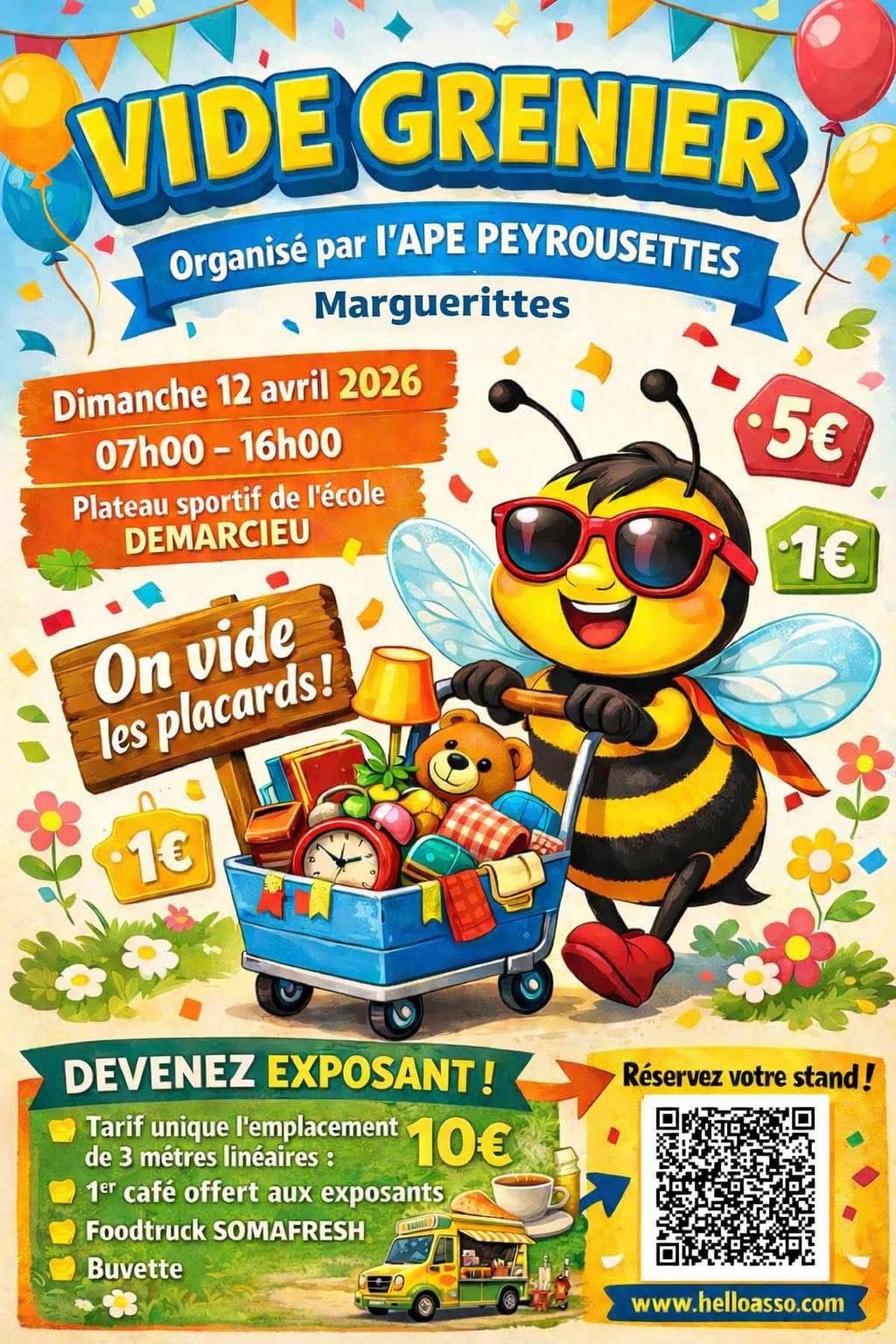 Dimanche 12 avril 2026 07h00 - Ouverture du vide-grenier 🐝 08h00 - Arrivée des exposants 🚚 09h00 - Buvette ouverte ☕ 12h00 - Pause déjeuner avec foodtruck SOMAFRESH 🍔 16h00 - Fermeture du vide-grenier 🔚