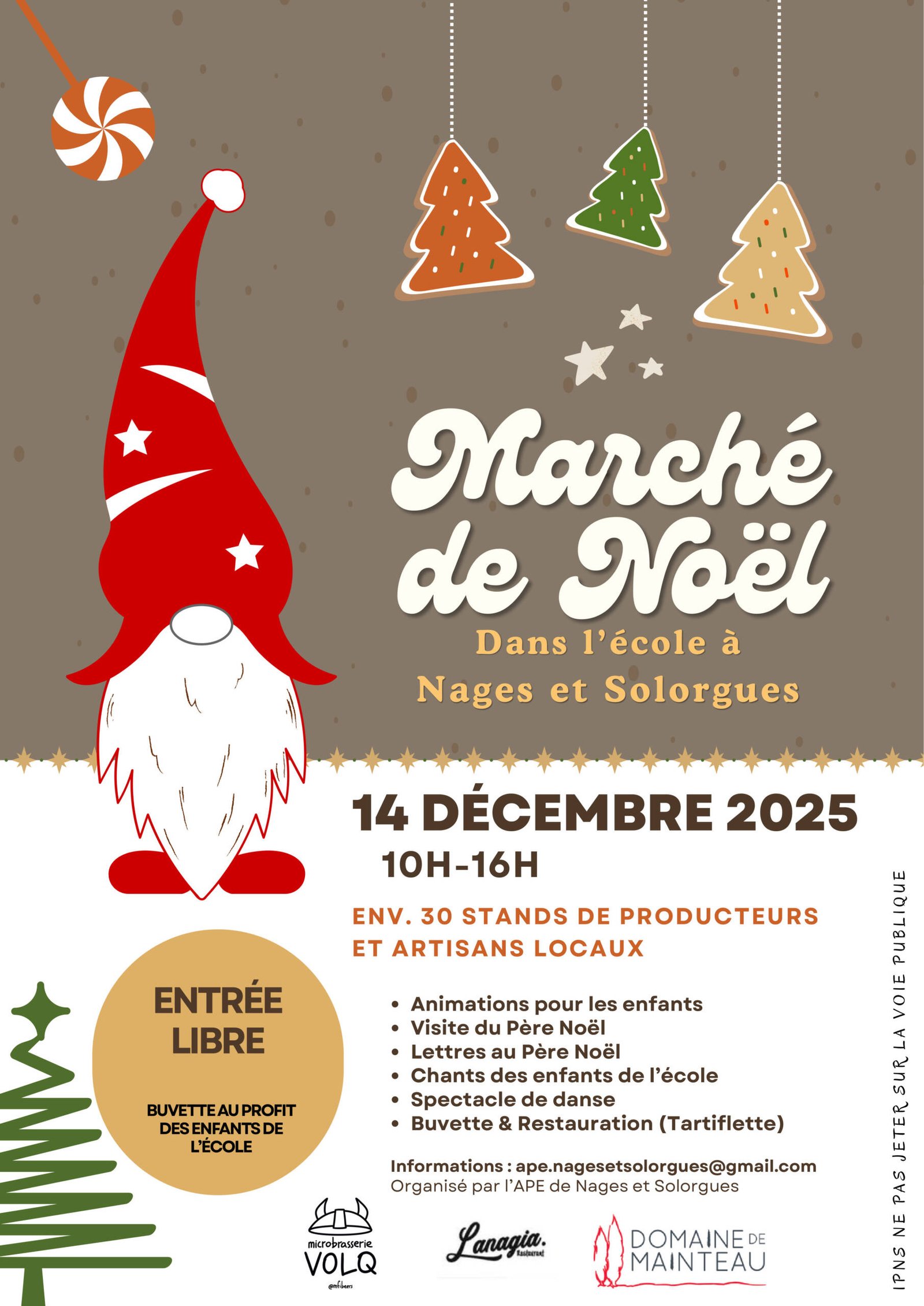 école de Nages-et-Solorgues Chemin des Aires 55, Nages-et-Solorgues, Gard, FranceNous organisons le dimanche 8 décembre un marché de Noël à Nages-et-Solorgues et aimerions que vous partagiez l'information. Trente exposants seront présents, l'association des parents d'élèves proposera buvette et petite restauration et des animations pour les enfants : château gonflable, balade à dos d'ânes, chasse au trésor, sans oublier la visite du père Noël. Rendez-vous le dimanche 8 décembre de 10h à 16h à l'école de Nages-et-Solorgues.
