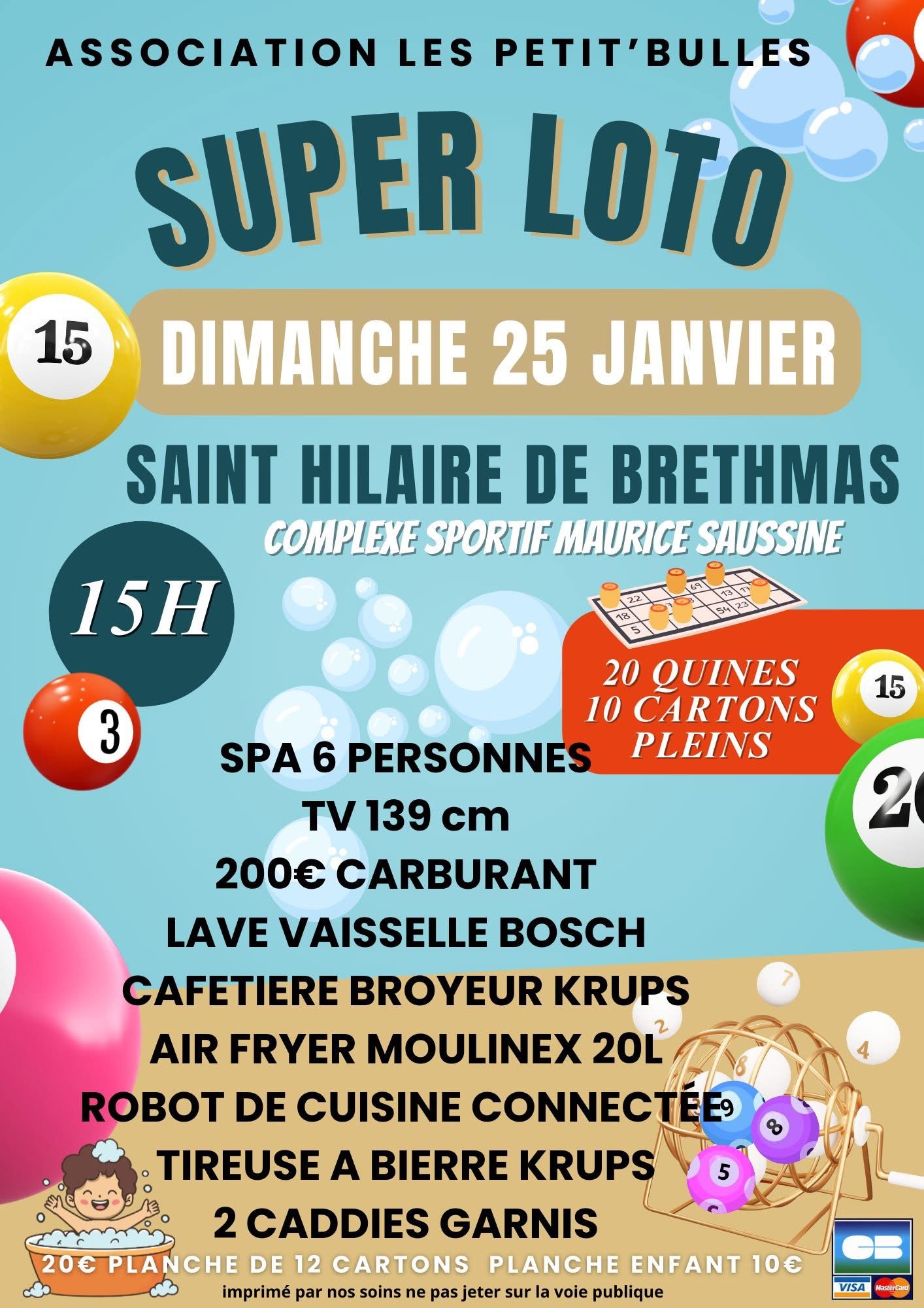 Dimanche 9 février 2025 14H : Loto 15 QUINES + 4 CARTONS PLEINS + 1 CARTON VIDE SPA GONGLABLE AIR FRYER NINTENDO SWITCH Caddie garni - Bon carburant - Tassimo - Vidange chez Feuvert - Bouteilles de vin - Appareil à fondue + un tas de lots! Ouverture des portes à 13H 2€ le carton / 10 € les 6 cartons
