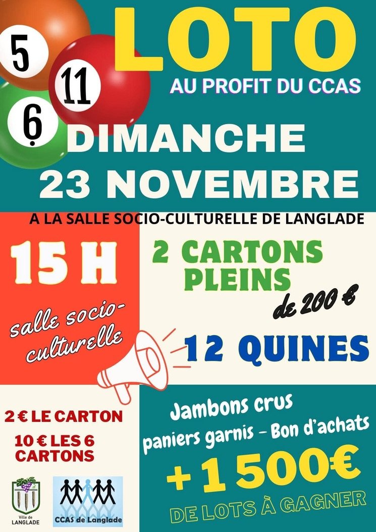 Salle socio culturelle - Langlade Route des Pinèdes, Langlade, Gard, FranceDimanche 23 novembre 15h00 : 🎉 Début du loto au profit du CCAS 🎟️ 2 cartons pleins de 200€ 🔔 12 quines 🥓 Jambons crus, paniers garnis, bons d'achats 🏆 +1500€ de lots à gagner