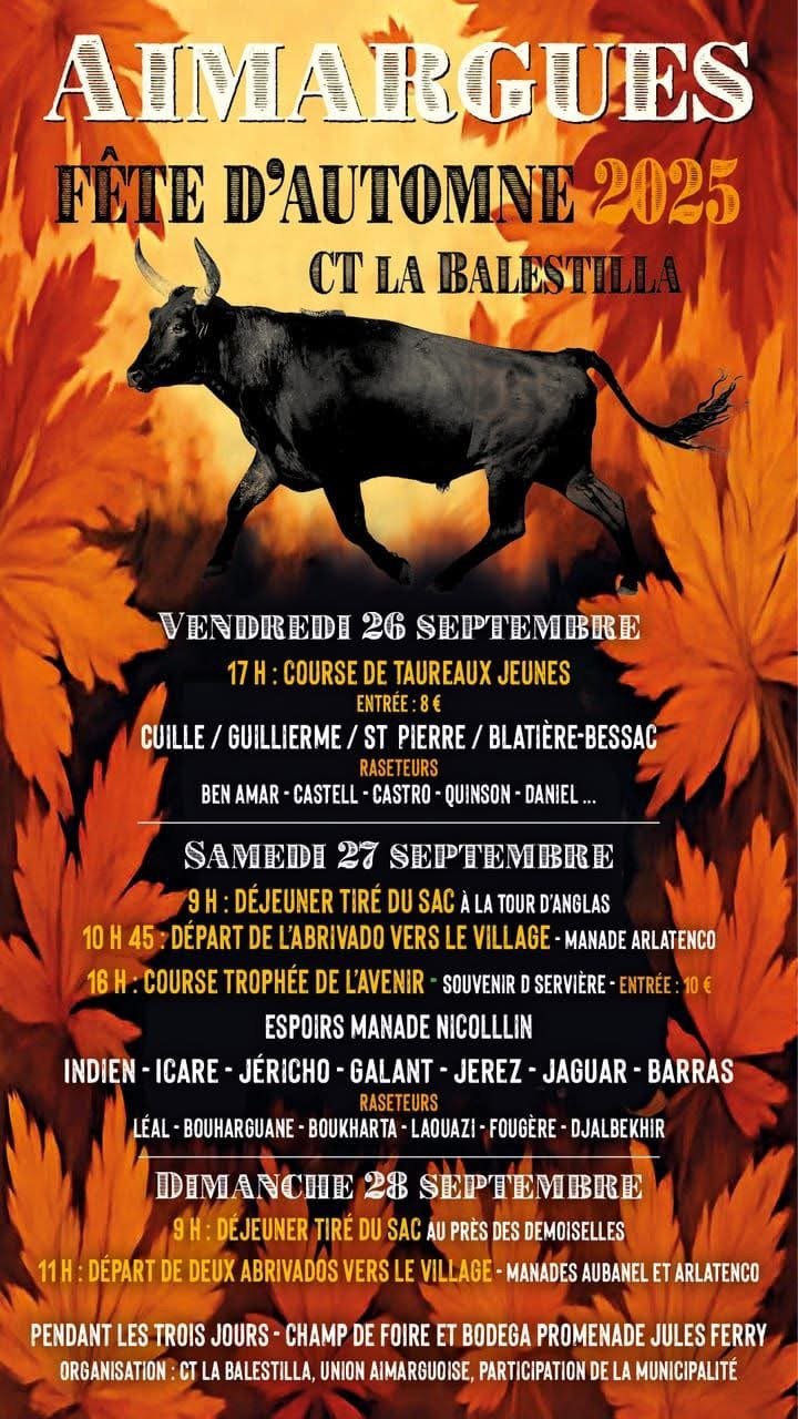 Vendredi 26 septembre 17 h : Course de taureaux jeunes 🐂 - Entrée: 8€ Raseteurs : Ben Amar, Castell, Castro, Quinson, Daniel... Samedi 27 septembre 9 h : Déjeuner tiré du sac 🍽️ à la Tour d'Anglas 10 h 45 : Départ de l'abrivado vers le village 🐎 - Manade Arlatenco 16 h : Course Trophée de l'Avenir 🏆 - Souvenir D Servière - Entrée: 10€ Espoirs Manade Nicollin : Indien, Icare, Jéricho, Galant, Jerez, Jaguar, Barras Raseteurs : Léal, Bouharguane, Boukharta, Laouazi, Fougère, Djalbekhir Dimanche 28 septembre 9 h : Déjeuner tiré du sac 🍽️ au près des demoiselles 11 h : Départ de deux abrivados vers le village 🐎 - Manades Aubanel et Arlatenco Pendant les trois jours : Champ de foire et bodega 🎉 - Promenade Jules Ferry