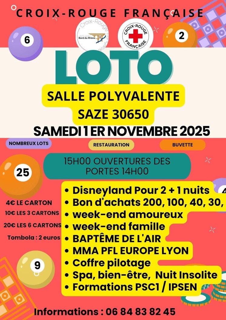 Méga loto de Noël à Aramon le dimanche 15 décembre à 15h00 Salle des fêtes Eugène Lacroix à Aramon Lots : Séjour 1 semaine Lots High Tech Nintendo Switch Bons d'achats 30/40/50/100/200 Et pleins d'autre lots 4€ le carton 10€ les 3 cartons 20€ les 6 cartons Tombola 2€ Venez nombreux tenter de remporter ces cadeaux incroyable. Pour tout lot de 6 cartons acheté, un cadeau offert. Contact et renseignements : 06 84 83 82 45 Possibilités de réserver une partie des tables.