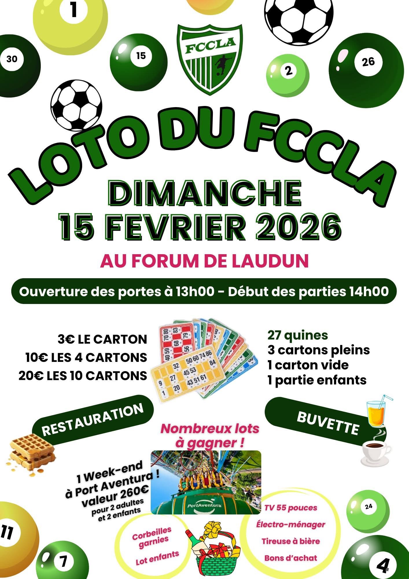 Dimanche 15 Février 2026 🕐 13h00 : Ouverture des portes 🎉 14h00 : Début des parties 🎟️ 3€ le carton, 10€ les 4 cartons, 20€ les 10 cartons 🏆 27 quines, 3 cartons pleins, 1 carton vide, 1 partie enfants 🎁 Nombreux lots à gagner : Week-end à Port Aventura, TV 55 pouces, électro-ménager, tireuse à bière, bons d'achat 🍽️ Restauration et buvette disponibles