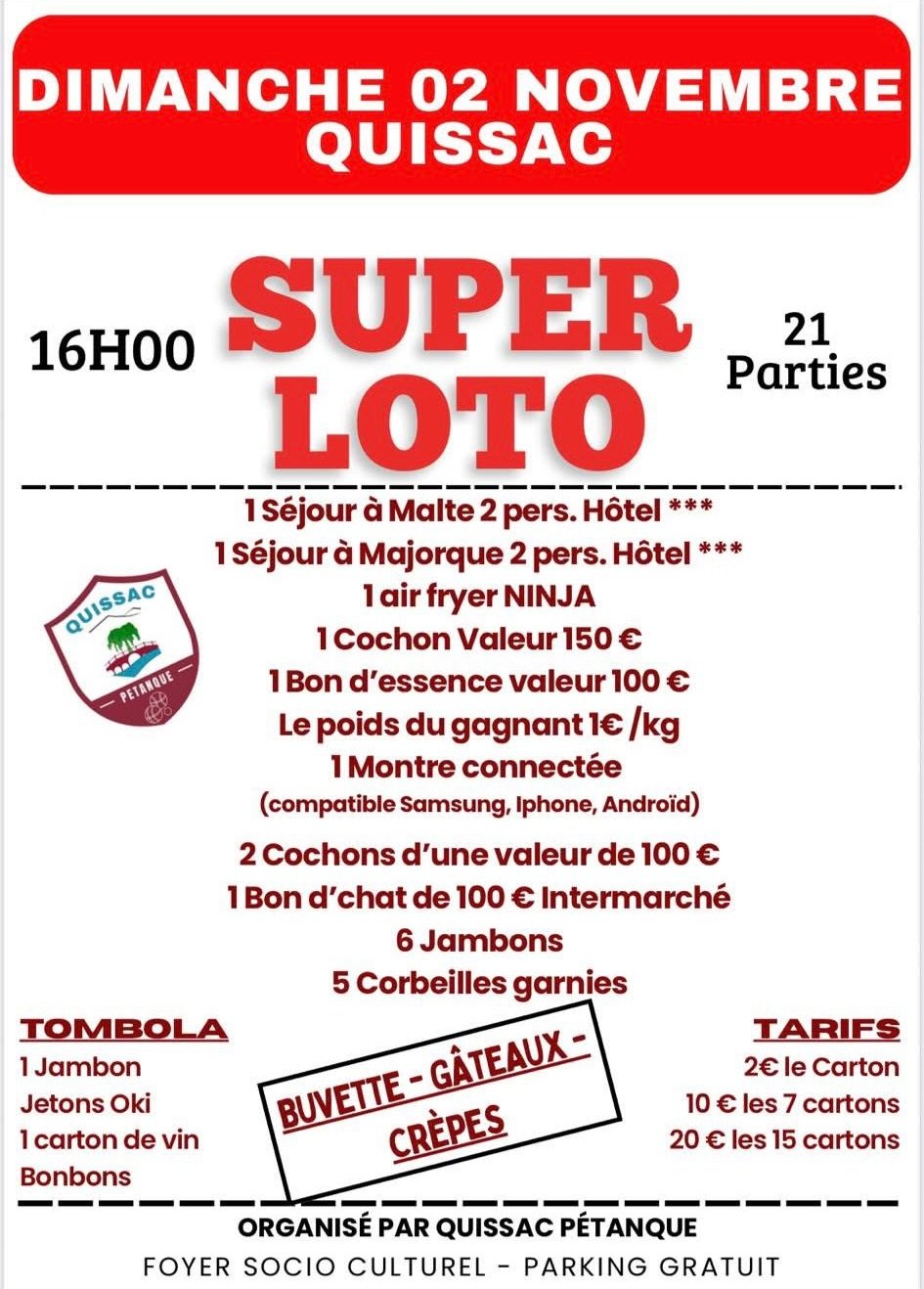 Foyer Municipal Désiré Rousset Quissac Avenue du Onze Novembre, Quissac, Occitanie, France21 PARTIES 1 Séjour à Malte 2pers. Hôtel 3* 1 Séjour aux Baléares 2pers. Hôtel 3* 1 TV 80cm 1 Cochon Valeur 150€ 1 Bon d'essence valeur 100€ Le poids du gagnant 1€/kg Un Aspirateur Balais Deux Cochons d'une valeur de 100€ 1 Bon d'achat 100€ Intermarché 6 Jambons 4 Corbeilles Garnies 1 Appareil à raclette / plancha modulable TOMBOLA 1 Rosette Jetons Oki 1 Carton de Vin Bonbons Cartons : 2€ Le carton 10 € Les 7 cartons 20 € Les 15 cartons