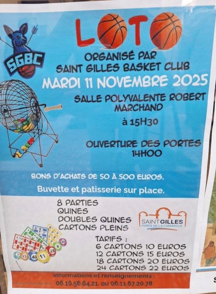Salle polyvalente Robert Marchand - Saint-Gilles Avenue Emile Cazelles, Saint-Gilles, Gard, FranceMardi 11 novembre 2025 🕑 14h00 : Ouverture des portes 🎉 15h30 : Début du Loto 🍽️ Buvette et pâtisserie sur place 🎁 Bons d'achats de 50 à 500 euros 🎟️ 8 parties : Quines, Doubles Quines, Cartons Pleins 💸 Tarifs : 6 cartons 10 euros, 12 cartons 15 euros, 18 cartons 20 euros, 24 cartons 22 euros